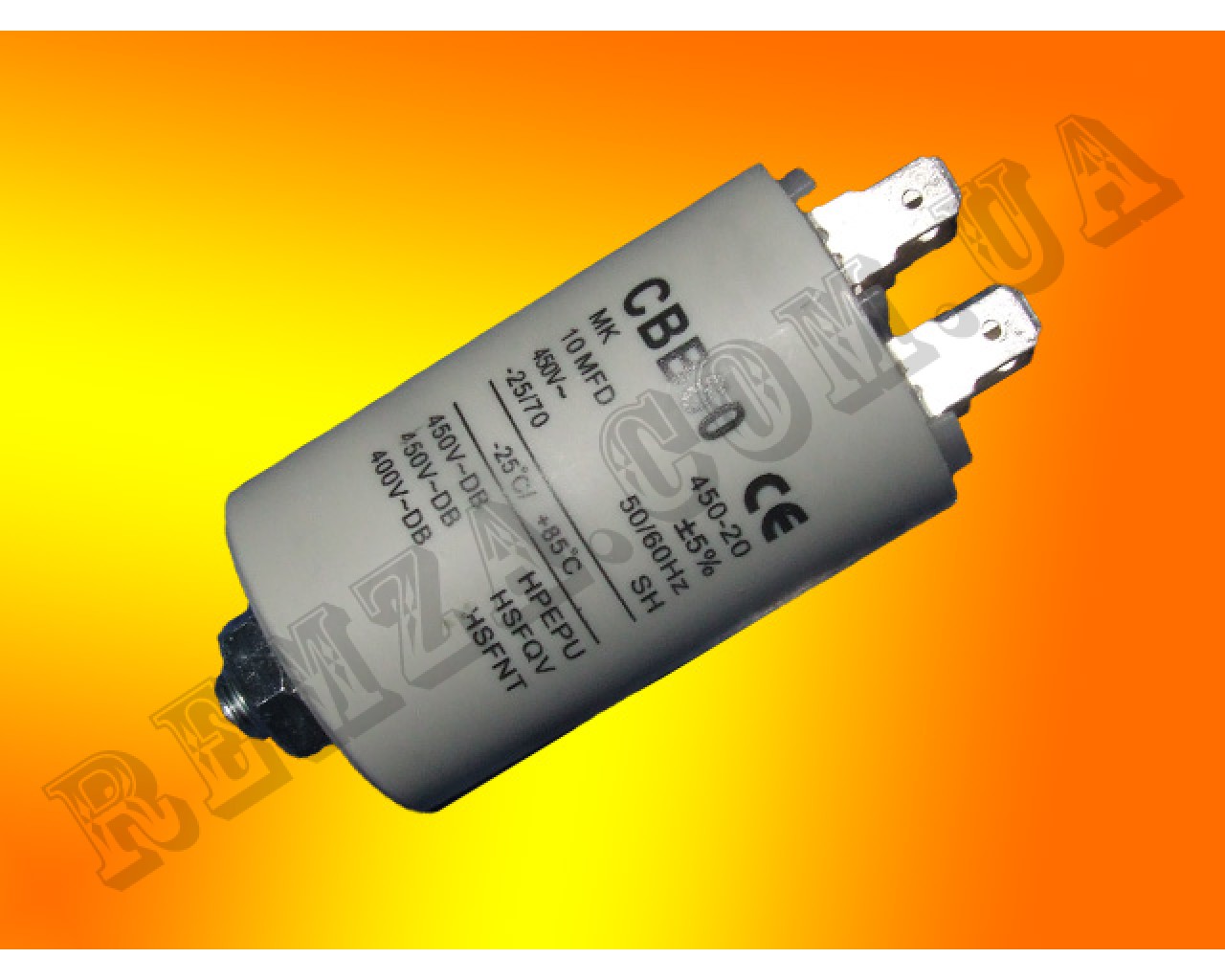 Конденсатор для стиральных машин, 10mf, Максимальный вольтаж: 450V, Диаметр: 32 мм (+/-10%), Высота: 70мм (+/-10%), Крепление: Шпилька М8 * 10мм