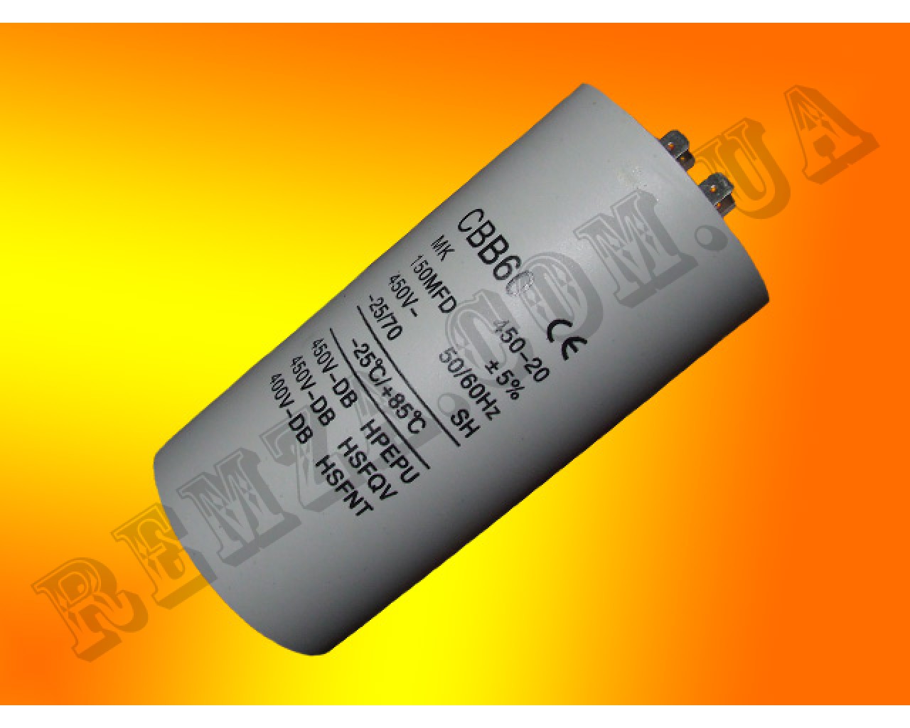 Конденсатор для стиральных машин 150 мкФ. Максимальный вольтаж: 450V, Диаметр: 63 мм (+/-10%), Высота: 140 мм (+/-10%), Крепление: Шпилька М8 * 10мм
