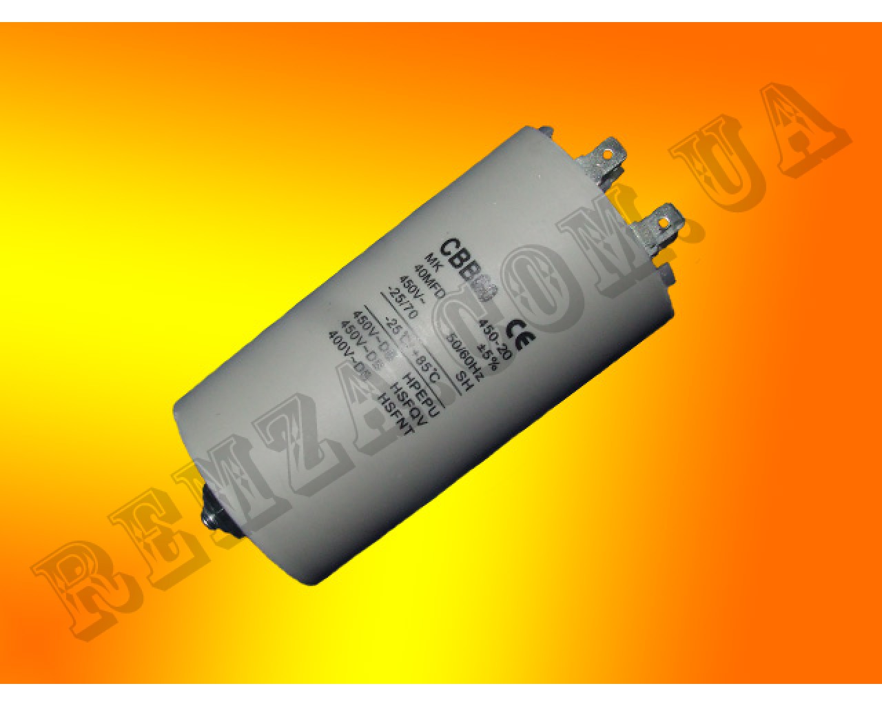 Конденсатор для стиральных машин, 40 mf, Максимальный вольтаж: 450V, Диаметр: 50 мм (+/-10%), Высота: 105 мм (+/-10%), Крепление: Шпилька М8 * 10мм
