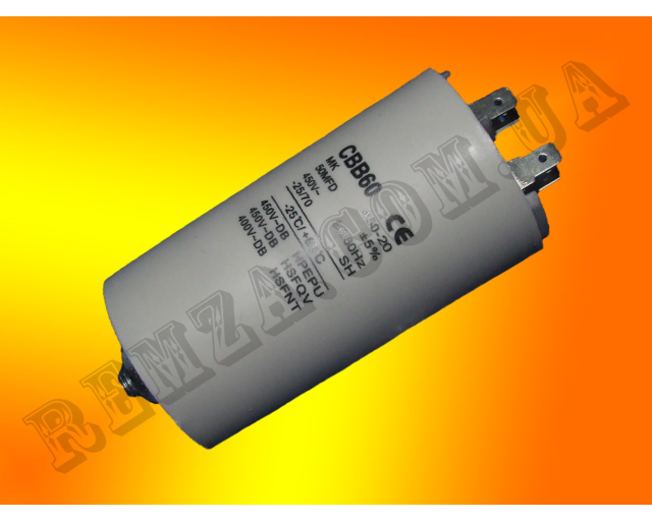 Конденсатор для стиральных машин, 50 mf, Максимальный вольтаж: 450V, Диаметр: 50 мм (+/-10%), Высота: 105 мм (+/-10%), Крепление: Шпилька М8 * 10мм